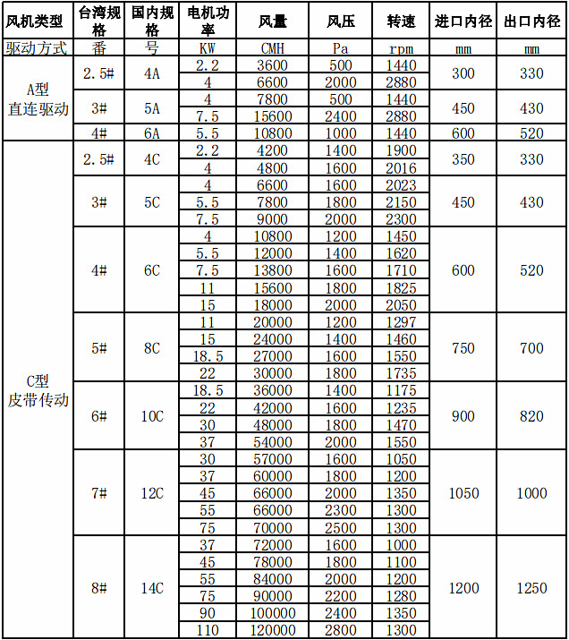 本公司生產(chǎn)的風(fēng)機(jī)引進(jìn)的技術(shù)為臺灣生產(chǎn),在臺灣風(fēng)機(jī)的型號大小稱作番,代表字母是#,但是在國內(nèi)統(tǒng)稱為號,用A或C代表。